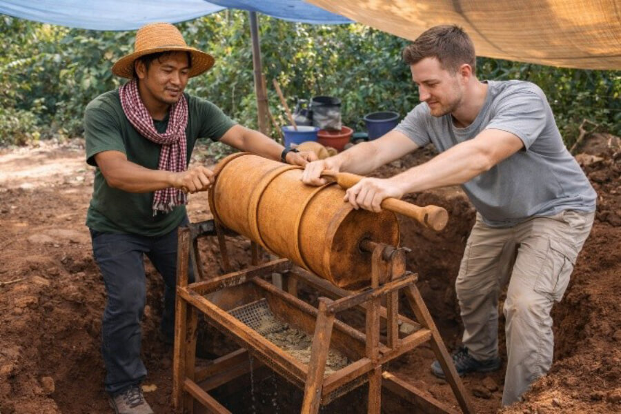 Visit the gemstone fields of Borkeo District and see how local Cambodian villagers dig for natural stones like blue zircon and amethyst. Using simple tools and traditional methods, miners carefully sift through the red soil to uncover hidden gems. This experience gives visitors a close look at the hard work, skill, and daily life behind Ratanakiri’s famous gemstone industry.